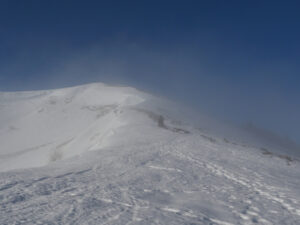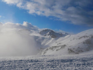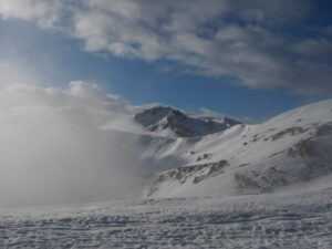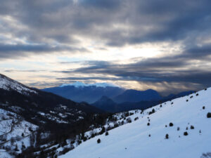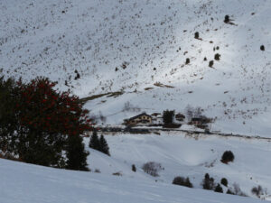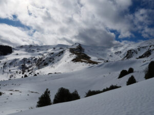 Au départ, la pente exige quelques efforts jusqu’au sommet. Quelques imprudences en ces températures proches de 0° sont à éviter. Les pointes des raquettes ne sont pas de taille à s’affronter avec de pentes trop fortes sur la neige durcie par le froid. La curiosité qui a tendance à nous rapprocher des bords enneigés peut s’avérer dangereuse car le plaque à vent n’attends plus que qelques kilos pour s’écrouler.